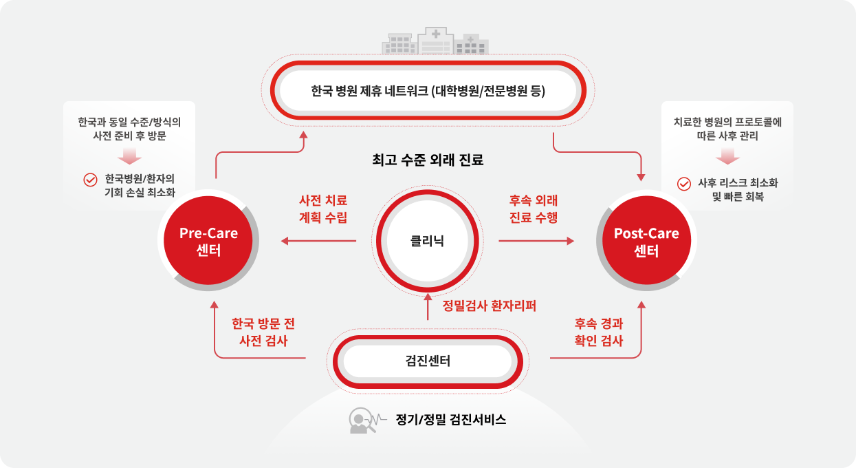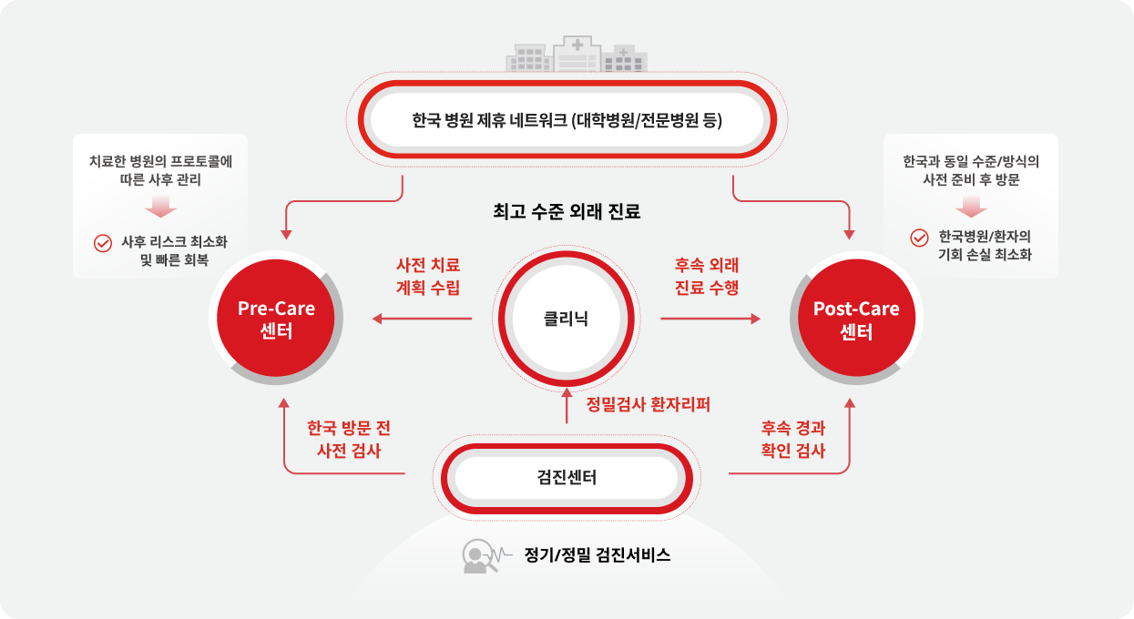 해외 환자의 치료 전·후 건강 관리를 지원하는 PPCC(Pre & Post Care Center) 서비스를 제공합니다.
